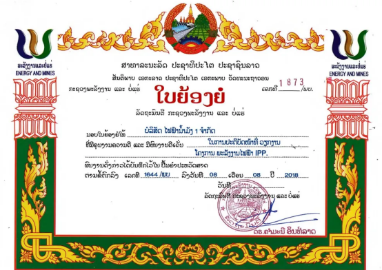 期间,老挝能源矿产部向老挝南芒河电力有限公司授予荣誉证书,表彰优发国际为老挝社会经济发展所作出的突出贡献。