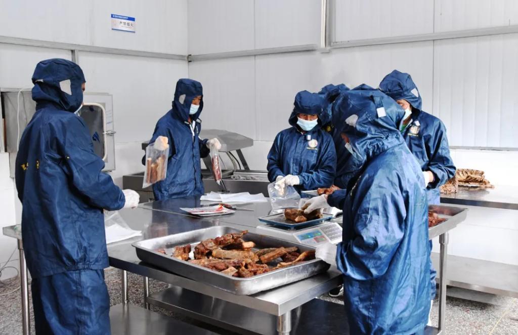 在东方特惠乌金猪产业园腊制品生产车间,工人们身着防护服,正有序制作外地客人预定的一批乌金猪腊肉,切割、称重、装袋、抽真空……他们紧密配合,操作规范、动作娴熟。据车间负责人介绍,这里的工人全是经过系统培训后上岗的当地村民,原材料也都是村民们养殖的乌金猪。从收猪到做成腊制品全过程,均建立严格管理管控机制,从源头严格保障产品品质。